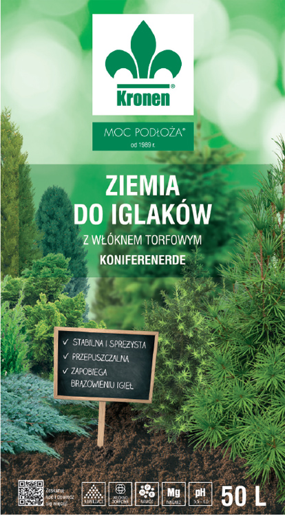 Ziemia do iglaków Kronen z włóknami torfowymi jest gotowym do użycia podłożem przeznaczonym do sadzenia i przesadzania roślin iglastych w pojemniki i w glebę.